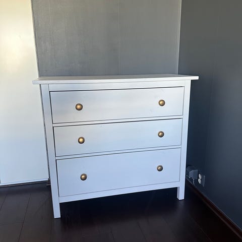 IKEA byrå/sängbord/nattduksbord HEMNES med 2 lådor, vitbets. Sliten på toppen (se bild), annars bra skick. Inskruvade egna knoppar i matt guld. Hämtas i Solna i befintligt skick.