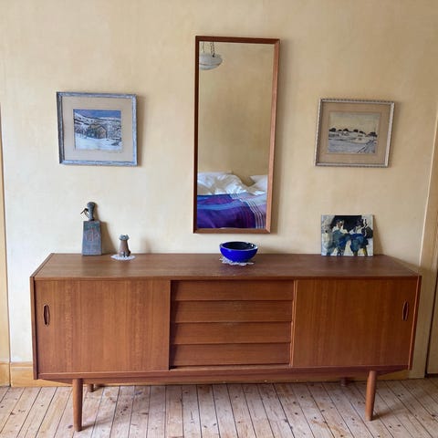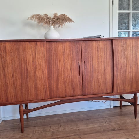 Fint teaksideboard från Ajfa i Tibro. Fyra lådor med trähandtag och grön filtbotten, tre låsbara dörrar med flyttbara hyllplan bakom. Lång och låg, utmärkt som tv-möbel. 50- eller 60-tal, fint skick!