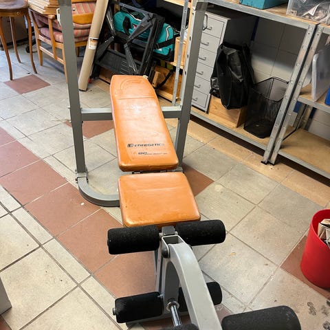 Trekkrunner träningsbänk med rak ryggdel och sits, lämplig för styrketräning i hemmet. Utrustningen inkluderar skivstång med viktskivor samt flera hantlar med justerbara vikter. Bänken har vadderad liggyta och stabil metallram. Setet kan användas för övningar som bänkpress, hantelpress, rodd, bicepscurl och andra överkroppsövningar. Passar för användning i hemmagym eller mindre träningsutrymmen. Medmera.