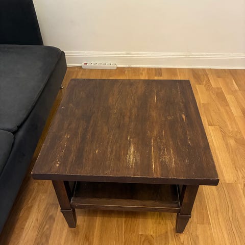 Mindre bord i grå färg med rektangulär bordsskiva och nedre hyllplan för extra förvaring. Bordet har svängda ben och är lämpligt som soffbord eller sidobord i vardagsrum eller liknande utrymme.