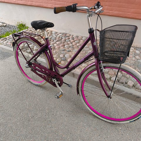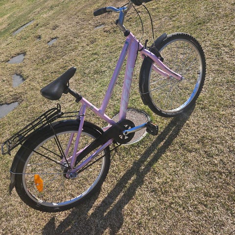 Crescent barncykel med 24" hjul i lila färg. Cykeln har tre växlar med vridreglage på styret och fotbroms bak. Utrustad med pakethållare, kedjeskydd, skärmar och stöd. Passar barn som vuxit ur mindre barncyklar och behöver en cykel i 24-tumsstorlek för vardagscykling och fritidsbruk.