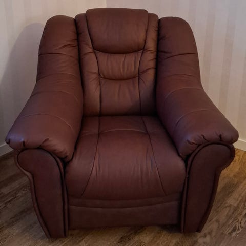 Skinnfåtölj svart med träsniderier