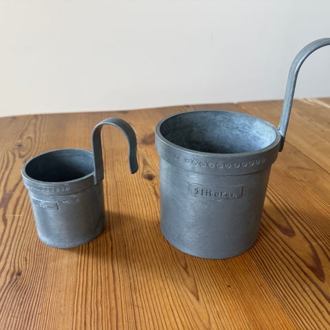 Vintage litermått i bleckplåt, för att tex ha köksredskap i. Säljer båda tillsammans, 200kr