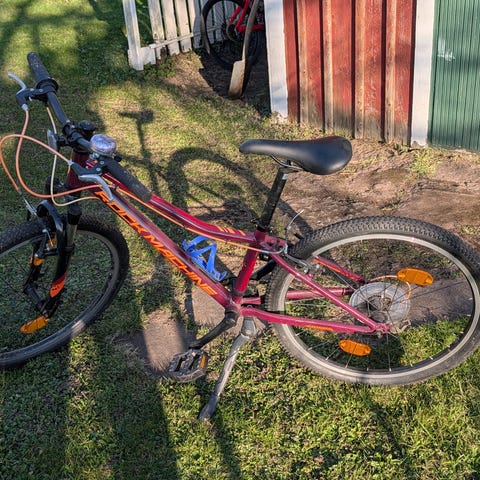 White barncykel med 24" hjul i röd färg. Skivbromsar fram och bak, utrustad med skärmar och standardpedaler. Ca 3 år gammal, några små märken annars bra skick.