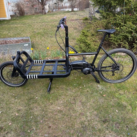 El-assisterat lastcykel. Tillverkad 2020 i Frankrike. Douze V2 med 80 cm lång låda. Plats för 4 barn. Cykeln kan delas på mitten (tar ca 5 minuter)