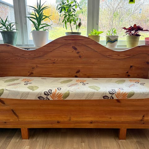 Gedigen soffa i furu. Tillverkad av Degerfors möbler. Nytt överdrag i konstläder finns att byta med om så önskas.
