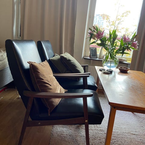 Fåtöljer: B 62, sittdjup 52, djup 65, sitthöjd 40, höjd 81 cm