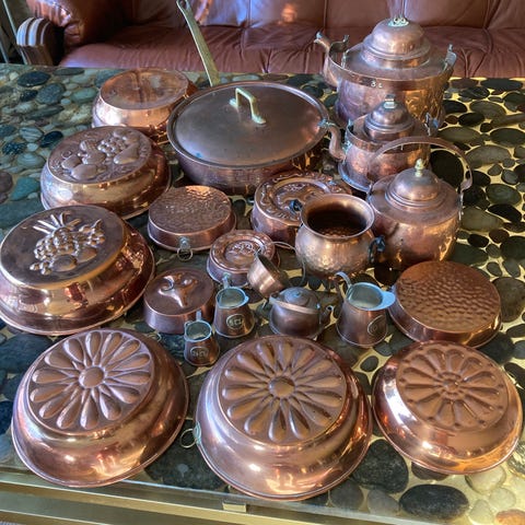 Set med flera formade kopparkärl avsedda att hängas på vägg, med upphängningsöglor. Passar som dekoration i kök eller matsal. Utförande i kopparfärgad metall med olika mönster och former.
