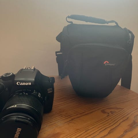 Äldre 1000d systemkamera med som legat på vinden länge. Passande kameraväska, laddare och uv filter finns även. Batteriet tar ladd och allt verkar vara i sin ordning. Hittar dock ingen shutter count men den är sparsamt använd