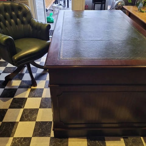 Engelsk fåtölj/kontorsstol “Captain’s Chair” i brunt läder. Fåtöljen har justerbar gungmekanism. Snurrmodell, höj- och sänkbar samt utrustad med hjul. Mycket fint skick.