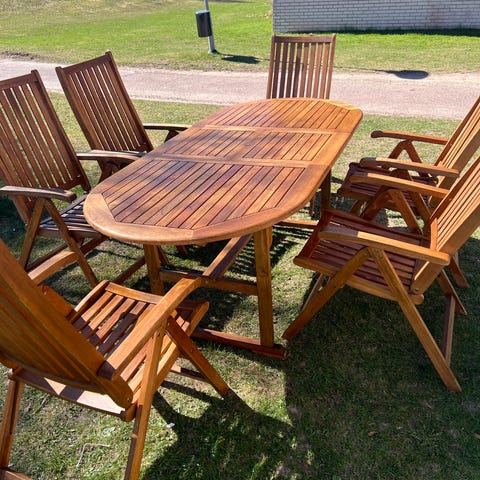 Komplett serie Jutlandia hardwood. Stabil träram och benstativ anpassat för altan eller uteplats. Det finns slitage och lite märken på stolarna och bordet.