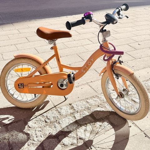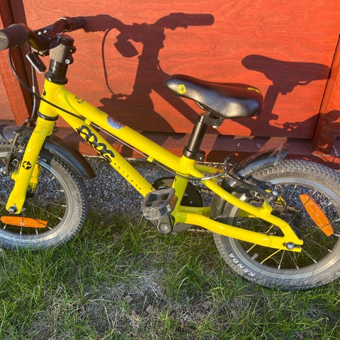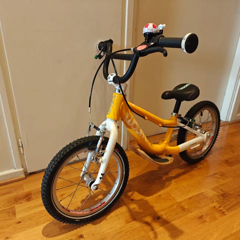 Woom barncykel med 14" hjul. Cykeln har lätt ram, fot- och handbroms samt justerbart styre och sadel. Passar mindre barn som ska lära sig cykla eller som första trampcykel efter balanscykel. Färg röd med vita detaljer.