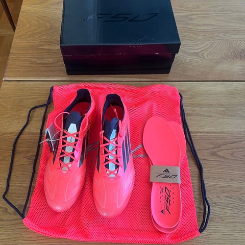 Adidas F50 Elite AG fotbollsskor i storlek 43 1/3. Skorna är avsedda för spel på konstgräs (AG) och har dobbar anpassade för detta underlag. Färgen är rosa med svarta detaljer. Medföljer gör utbytbara innersulor och en matchande skopåse. Lämpliga för fotbollsspelare som behöver lätta skor för konstgräsplaner.