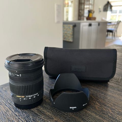 Sigma DC EX 17–70mm f/2,8–4,5 zoomobjektiv i svart utförande. Brännvidd 17–70 mm med variabel största bländare f/2,8–4,5, lämpligt för allt från vidvinkel till kort tele. Objektivet har zoom- och fokusringar med tydlig markering av brännvidder och avstånd. Levereras med fram- och baklock samt motljusskydd enligt bilderna. Även linsskydd finns påkopplat.