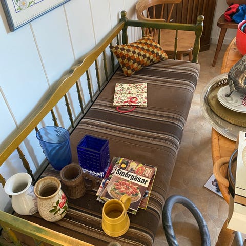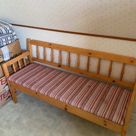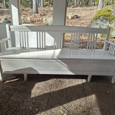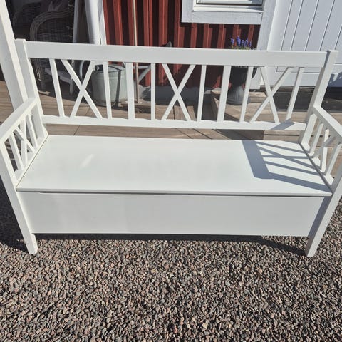 Vitlackad kökssoffa i trä. En del mindre skrapmärken men i gott skick för övrigt. Försöker visa en del av märkena på bilderna men fler liknande märken finns.