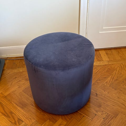 Sittpuff / fotpall i blå sammet med dekorativa fransar.