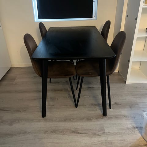 Säljer ett stilrent och kompakt matbord med två tillhörande stolar – perfekt för mindre kök,.