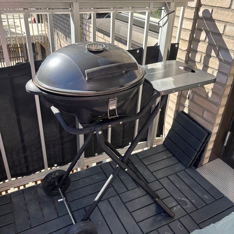 Landmann bärbar kolgrill med lock i svart utförande. Grillen har rund grillgaller och lock med ventil för reglering av luftflöde. Handtag och grilltång har greppvänliga detaljer i gul färg. På bilderna syns även grillkol och tändkuber som kan ingå som tillbehör beroende på överenskommelse. Lämplig för kolgrillning utomhus, exempelvis på uteplats eller vid utflykt där kolgrill är tillåten.