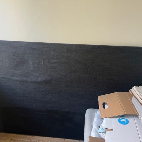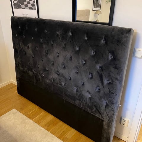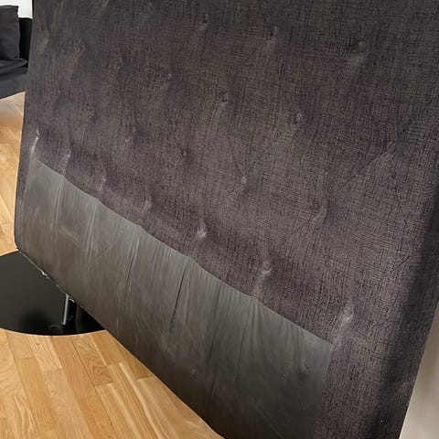 Mio sänggavel i mörkgrå textil med knapptuftad framsida. Gaveln är fristående med ben och kan placeras direkt mot väggen bakom sängen. Passar som huvudgavel till säng och ger ett mjukt ryggstöd vid sittande. Ytmaterialet är tyg med struktur i en mörkgrå nyans.