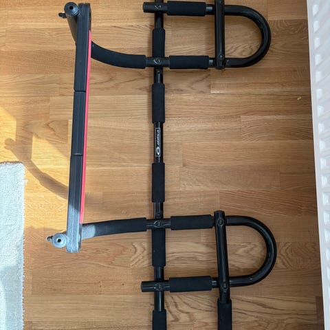Dörrmonterad chin up-stång med flera greppytor. Stången monteras i en dörrkarm utan fasta installationer och kan tas ned efter användning. Utrustad med skumklädda handtag för bättre grepp och ökad komfort vid träning. Lämplig för övningar som chins, pull ups och magövningar i hemmet.