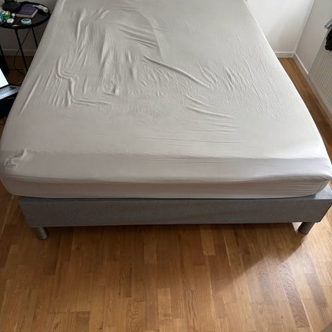 IKEA Sultan Storfors säng med madrass i vit färg. Sängen har hög gavl och rak, enkel ram i trä. Madrassen är klädd i ljust tyg med struktur. Passar som vanlig säng i sovrum eller gästrum.