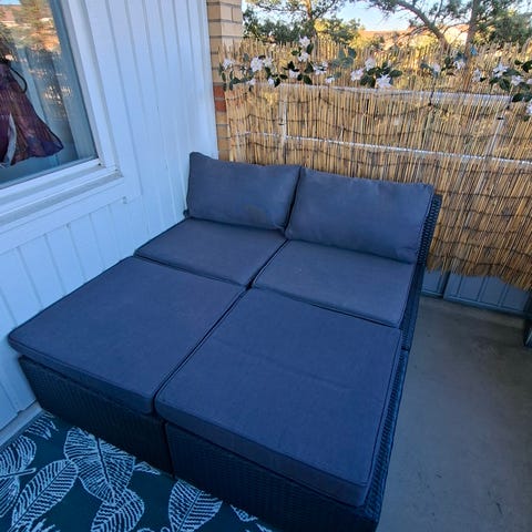 Köpt på Rusta för knappt tre år sedan. Klädseln är något blekt men i övrigt är soffan i bra skick.