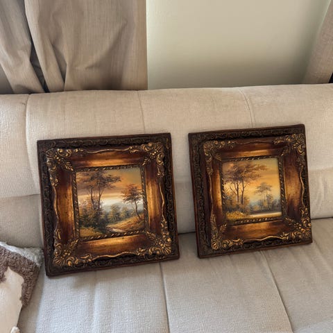 Två landskapsmålningar av okänd konstnär i dekorativa, profilerade guldfärgade ramar. Motiven föreställer natur- och skogspartier vid vatten i varma färgtoner. Tavlorna är kvadratiska och inramade med breda, ornamenterade ramar som ger ett klassiskt uttryck. Passar exempelvis i vardagsrum, hall eller sovrum som väggdekoration.