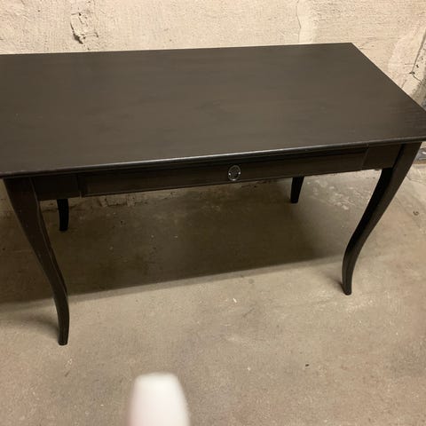 Matbord som nästan bara använts som skrivbord. Fin bordsskiva i naturfärgat trä och vitmålade träben. Utfällbar klaff.