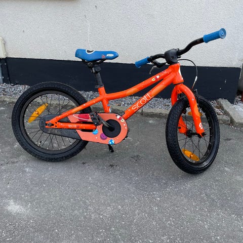 Barncykel 16 tum White med cykelhjälm. Passar barn runt 4-6 år. Allt fungerar bra men handtagen skulle ev. behöva bytas.