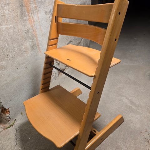 Stokke barnmatstol i trä med naturfärgad finish. Stolen har justerbar sitt- och fotplatta samt bygel med grenband för extra stöd. Passar som matstol för barn vid bord eller köksö. Klassisk konstruktion i massivt trä som ger stabilitet och lång användningstid i takt med att barnet växer. Vissa tecken på användning och slitage.