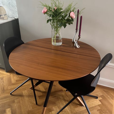 Storleken passar perfekt för 4–6 personer och fungerar lika bra i kök som i matsal.