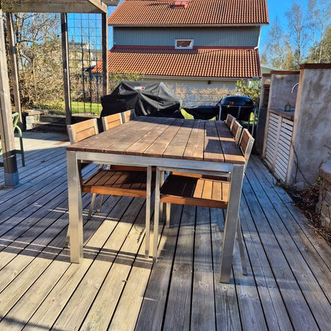 Trädgårdsgrupp bestående av ett rektangulärt bord och fyra stolar. Bordet har bordsskiva i trä och benstativ i metall med rak, enkel design. Stolarna har metallstomme med sits och rygg i svart nätmaterial samt armstöd. Stolarna är fällbara. Gruppen är avsedd för utomhusbruk, exempelvis på altan, uteplats eller i trädgård.