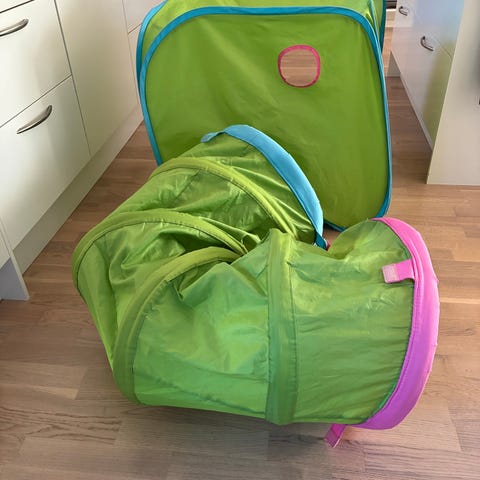 IKEA lektunnel för barn. 140 * 40 cm. Den är hopfällbar med fyra kardborreband för enkel förvaring och kan användas inomhus som kryptunnel och lekredskap. Invändiga bågar som håller formen när tunneln är utfälld.
