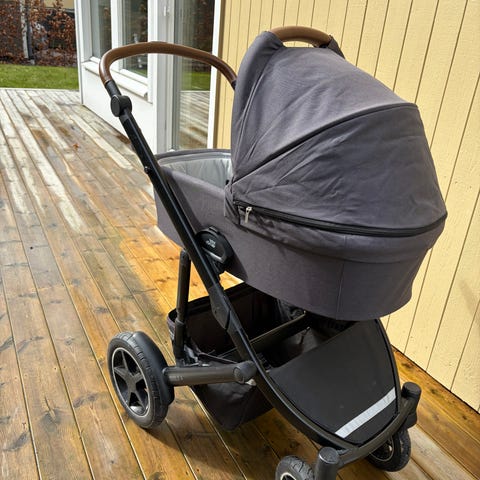 Römer barnvagn m liggdel för spädbarn i blå/grått tyg med svart chassi och detaljer i konstläder på handtag och bygel. Vagnen har svängbara framhjul och större bakhjul. Sittdelen har justerbart ryggstöd samt sufflett. Till vagnen hör en liggdel i matchande grå färg med madrass. Passar för användning från nyfödd i liggdel och vidare upp i åldrarna i sittdel. Stor varukorg under vagnen ger utrymme för packning vid promenader och vardagsärenden.