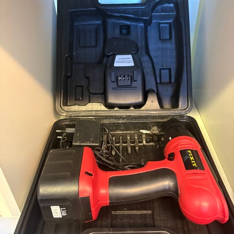 Sladdlös borrmaskin i blå färg med medföljande laddare. Maskinen har pistolgrepp och avtagbart batteripack monterat i handtaget. På ovansidan finns reglage för inställning av olika momentlägen. Passar för enklare borr- och skruvarbeten i hemmet. Märke och modell framgår inte tydligt av bilderna.