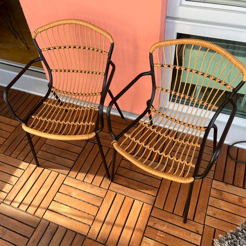 Stol i rotting med metallben i svart. Sits och rygg är flätade i brun rotting med rundad form som ger stöd för rygg och armar. Passar exempelvis på balkong, altan eller inomhus i vardagsrum eller matplats. Säljes som set med två likadana stolar.