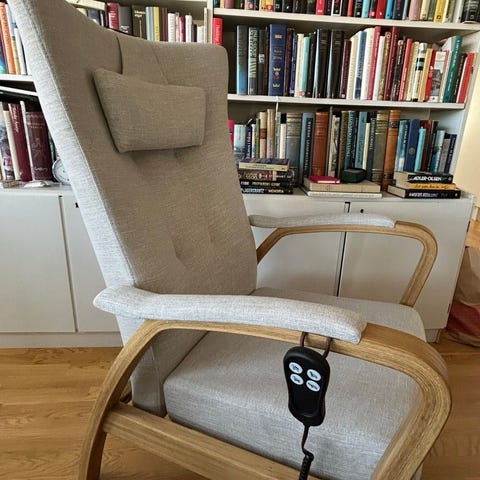 Säljer en bekväm och stilren fåtölj med fotpall från Swedese, modell Stepp. Svensk kvalitetsdesign med hög komfort och ställbar rygg – perfekt som läs- eller vilfåtölj.