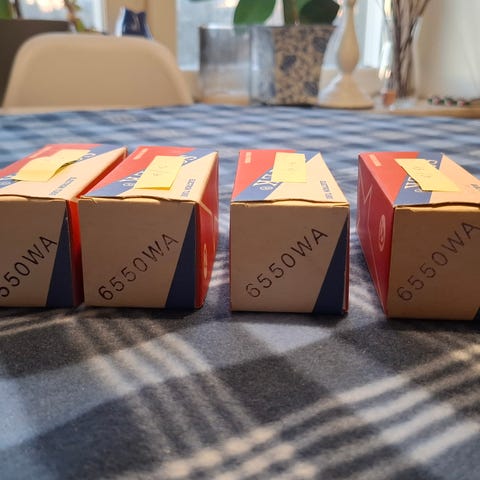 Matchat par av 12ax7WXT (12au7 / Ecc83) rör tillverkade i Reflektor fabriken i Saratov Ryssland i början av 90 talet innan de köptes upp av New Sensor Corporation.