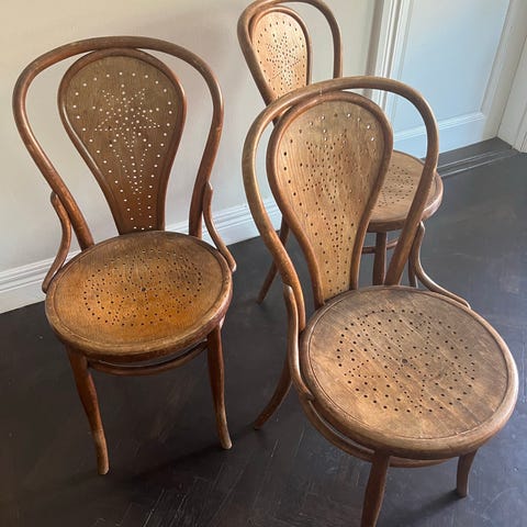Fina böjträstolar av märket Thonet. Alla stolar har stämplar. Alla tre är stabila att sitta på, en av stolarna har börjat släppa lite i rottingen men i övrigt fint skick(se bilder).De andra två mkt fint skick för sin ålder!