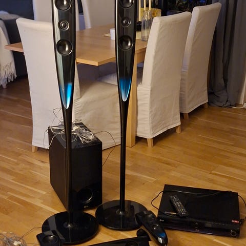 Systemet består av en huvudenhet med Blu-ray/DVD-spelare och tillhörande fjärrkontroll, två golvhögtalare, en centerhögtalare, två mindre surroundhögtalare samt en separat subwoofer.