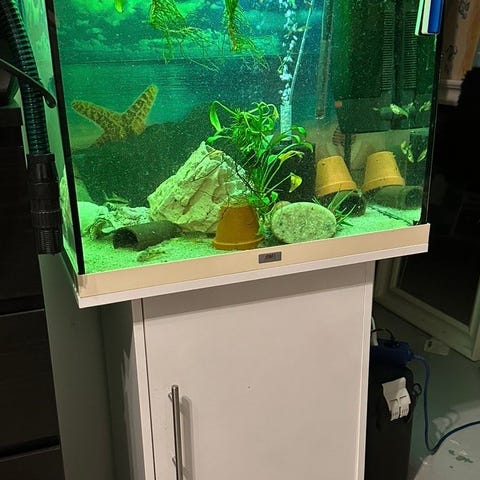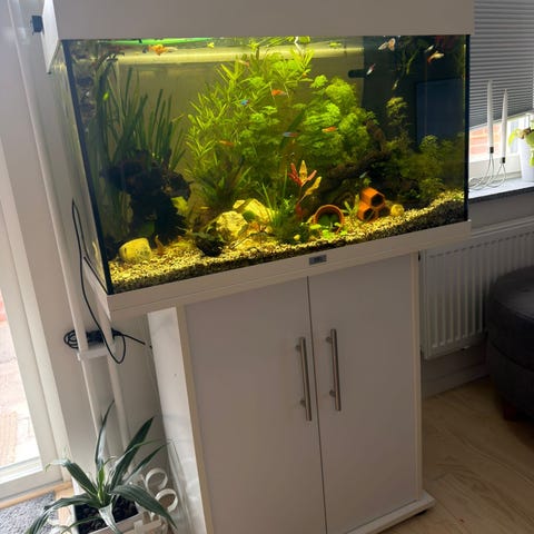 Akvarium med vit möbel och fiskar – komplett