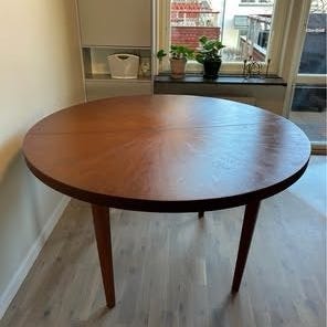 Charmigt och nätt retro köksbord med tre stolar i snygg 50/60-talsstil. Bordet har två iläggsskivor som enkelt dras ut och ger flexibel storlek. Stabilt och funktionellt med fin patina. Är litet nog att passa i små kök, men med iläggsskivorna är det flexibelt och praktiskt.