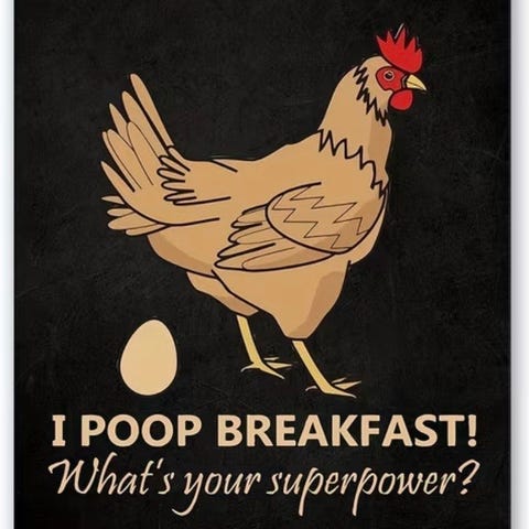 väggskylt med tecknat hönsmotiv i flera färger. Rektangulär skylt med texten ”Relax, we’re all crazy, it’s not a competition” och illustration av höns med olika frisyrer och uttryck. Passar som dekorativ inredningsdetalj på vägg i exempelvis kök, hall eller hobbyrum.