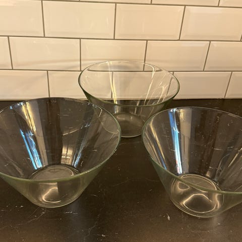 IKEA glasskålar med slipat mönster. Set om fem små skålar i klart glas med triangulär form och dekorativt bladmönster i glaset. Passar till servering av exempelvis dessert, snacks eller tillbehör vid bordet. Skålarna är stapelbara och enkla att förvara.