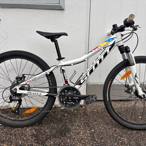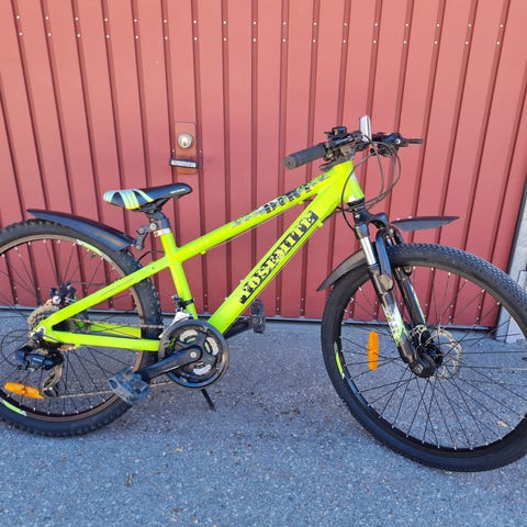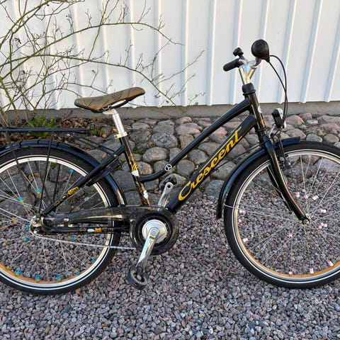 Crescent Jare barncykel med 24" hjul, 7 växlar, fjädrande framgaffel, handbroms fram och fotbroms bak. Utrustad med stänkskärmar, lås, ringklocka, reflexer, kedjeskydd och stöd. Det finns lite skavmärken här och var men cykeln är i fint begagnat skick och förvarad i varmgarage.