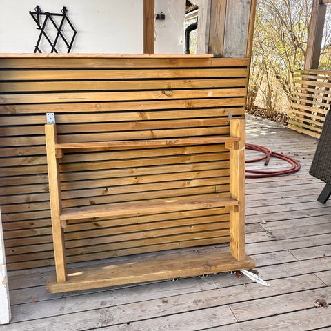 Egensnickrad bar för sommarens fester. Bortskänkes mot upphämtning. Byggd av lastpallar och trallvirke. Fettfläck finns på ovansidan, går nog att slipa bort. Tung! Man behöver vara flera som hjälper till att lyfta vid hämtning. Vi kan inte erbjuda bärhjälp.
