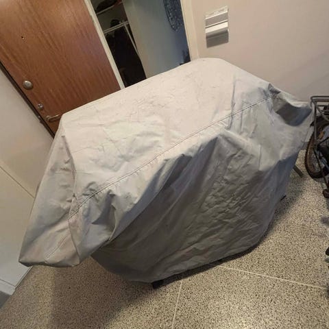 Burns & Barkles kolgrill i svart metall med inbyggd termometer i locket. Grillen har handtag i metall på lock och front, samt vev för justering av kolhöjd. Under grillen finns en hylla för förvaring av grilltillbehör. Konstruktionen står på ben med två hjul för att underlätta förflyttning. Ett överdrag i tyg medföljer för skydd vid förvaring utomhus. Pris diskutabelt