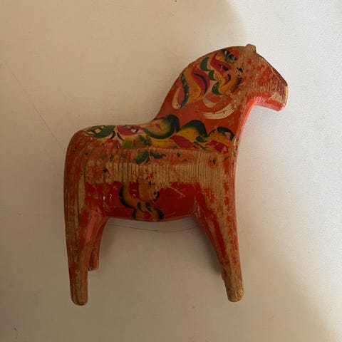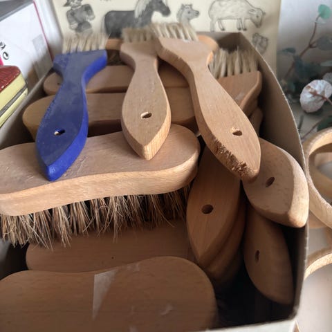 Made in Sweden hästformad liten borste i trä med svart borst. Borsten är utformad som en häst med huvud och svans i naturmaterial och en kropp i lackat trä. Den kompakta storleken gör den lämplig för exempelvis rengöring av kläder, bord eller mindre ytor. Märkt med metallskylt med texten "Made in Sweden" på sidan.