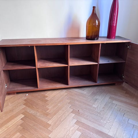 Sideboard i brunbetsat trä med kombination av lådor och dörrar. Framsidan har snedställda träpaneler på dörrarna och raka fronter på lådorna. Handtagen är raka och monterade vertikalt. Möbeln står på korta ben och har en slät ovansida som kan användas för TV, lampor eller dekoration. Passar som förvaring i vardagsrum, hall eller matsal. Den var specialtillverkad för oss. Den är i ganska bra skick men det finns några märken här och där, till exempel på toppen - som syns på bilderna.