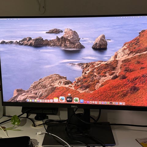 Skärmen är en platt 27-tums monitor som lämpar sig för arbete och vardagsanvändning. Modellen har flera anslutningar på baksidan, bland annat USB-portar samt bildingångar för anslutning till dator. Skärmen står på ett stabilt stativ med justerbar lutning.